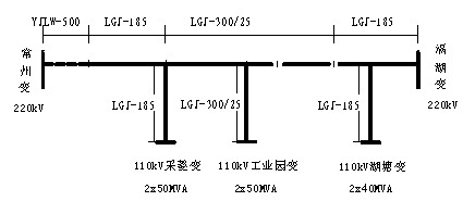 常白线上现状接2个110kV变电所,分别是:110kV采菱变,2x50MVA主变;110kV工业园变,2x50MVA主变。另原先还接有110kV湖塘变(2x40MVA),因输送容量不足,现已临时断开。
