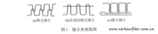 缝合技术发展至今已有悠久的历史,但它在复合材料领域的应用才不过几十年,并且多被应用在缝合层合板复合材料上。它是提高结构损伤容限和层间断裂韧性的有效途径。缝合工艺使用碳、玻璃、Kevlar做成的缝合线在工业缝纫机上对织物进行厚度方向的缝合。缝线仅占复合材料纤维体积含量的百分之几。目前芳纶纤维由于其特殊的耐磨性、良好的抗冲击韧性和较低的纤维密度,在缝合过程中得到广泛应用。锁式缝合和链式缝合[6,7]是缝合线迹的两种基本型式,如图1所示。锁式缝合会在面纱与底纱之间形成两个缝合线圈,在织物中间相交,产生应力集中;点改进的锁式缝合可以穿过织物厚度,提高分层韧性和损伤容限,因此使用较多;链式缝合类似于针织,缝合线多次挠曲,操作复杂,使用较少。 123456