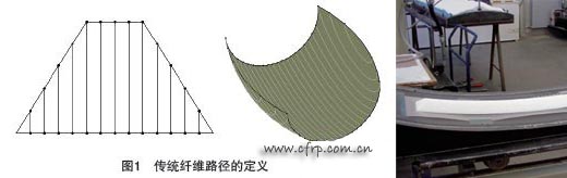 复合材料结构中的主要承载材料为纤维,纤维方向的可设计性是其特点之一。迄今为止,对预浸料铺叠成型复合材料结构中的纤维方向的定义都很笼统,一般只是规定了结构中某一点的纤维方向,其余纤维并行铺放(图1)。本课题基于对复合材料结构中某一组合单元在指定方向上应具有最大承载能力的要求,提出了纤维路径的概念,并由每层纤维并行排列、连续纤维均布性、纤维面密度值固定的规定,引申出每层纤维的连续性和连续纤维均布性指标,提出了最大铺叠宽度和最小铺叠宽度的工艺参数,并针对一些典型曲面的纤维路径提出了铺叠工艺的实施方法。