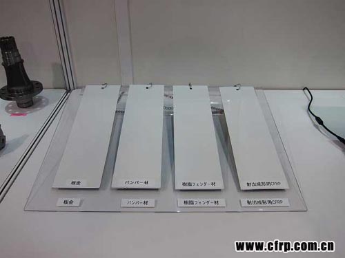 图:碳纤维强化PP的成形样品 最右边写着“射出成形用CFRP”的是在碳纤维强化PP成形品上涂了白漆的样品。从左边起依次是钢板、保险杠用PP成形品、在挡泥板用树脂成形品上涂了白漆的样品。