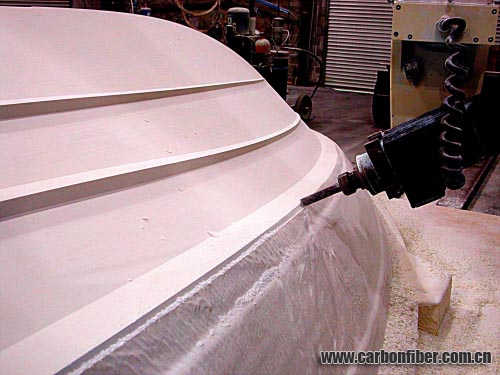 根据计算机数据进行的CNC加工是非常精确的。母模生产用的可加工复合材料模具板和板材来自不同的制造商。这些产品范围从聚氨酯泡沫、合成环氧树脂到碳泡沫。这些材料粘结在一起后,被加工成特定的模具形状,然后将其密封防止层压树脂渗透,并用双马来酰亚胺或环氧层压板包覆,最后才进行机加工。