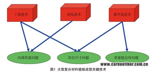 整体成型的大型复合材料壁板制件,针对其结构特点以及存在的主要问题,其成型的关键技术主要有3个方面:工装技术、固化成型技术、数字化技术,如图1所示。