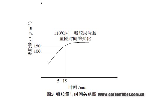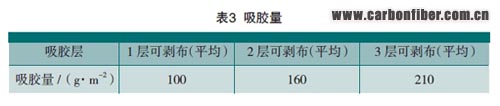 大型复合材料壁板因为厚度变化大,所以各个区域余胶量分布不均,在制件制备过程中则要通过预吸胶环节控制各个区域厚度在标准范围之内,这就要求我们对预吸胶工艺进一步掌握。吸胶材料和吸胶时间是对吸胶量的关键影响因素,如表3和图3所示。