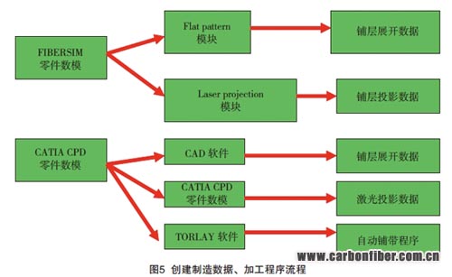 通过构建复合材料数字化制造技术的软件平台,采用专用设计、工艺软件建立复合材料零件三维数模(工程数据),进而建立制造数据集、程序,实现与自动下料机、投影定位、自动铺带机等数字化设备的接口,为复合材料数字化制造技术应用打下基础,如图5所示。