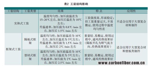 不同结构形式的工装,结合复合材料零件的实际制造情况,对复合材料的成型工艺过程会产生不同的影响,尤其是对复合材料零件固化过程中的加热效率以及温度均匀性的影响。具体情况如表2所示。