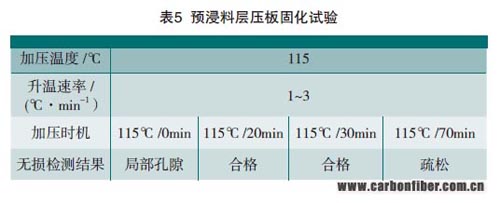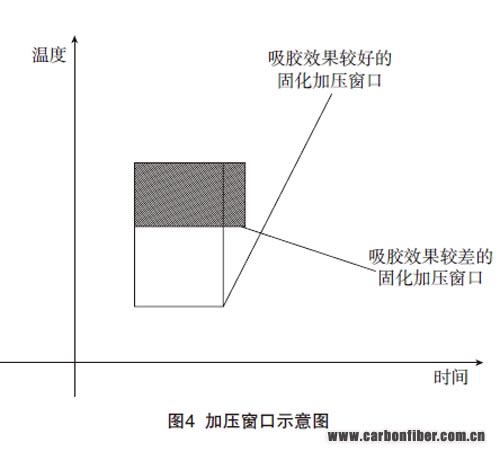 经过试验和工艺验证,应该转变我们的工艺观点,应注重预成型工艺和吸胶效果。如果吸胶效果不好其坯料中的挥发份、气体就不能有效排除,那么在固化过程中隐患比较大,固化工艺的选择尤为严格,某种意义上讲其加压窗口范围更小。而反之若预成型工艺效果理想,坯料中的挥发份、气体有效排除,结构密实,那么固化过程中出现问题的机率较小,固化工艺相对比较好控制,对加压时机不那么敏感,尤其是提早加压对零件固化质量影响不大,一定程度上反而是拓宽了加压窗口,如图4所示。