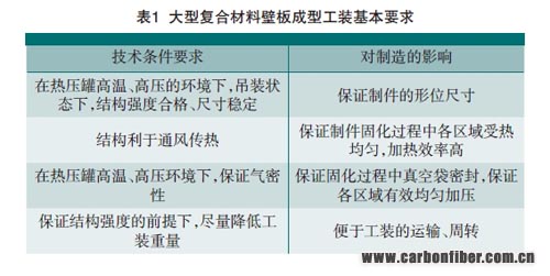 工装是复合材料制件的成型基础,工装既要保证复合材料制件的形位尺寸,同时又要充分适应复合材料制件的成型工艺特点——传热、传压等,所以工装技术是复合材料研制的关键因素,复材成型工装基本要求如表1所示。