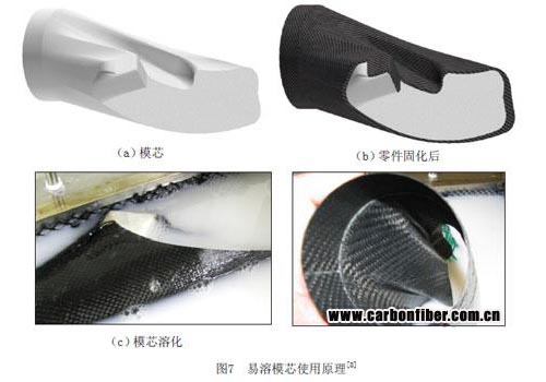 易溶模具是指采用在某种溶剂中易于溶解的材料运用浇铸法或模压法制成空心或实心的模具。复合材料构件依赖这种模具成型后,从开口处通入合适温度的溶剂,使模具材料溶解进而从构件中流出。低溶盐和石膏是常用的芯模材料。另外,水溶性型芯材料也可由粘结剂和陶瓷填料组成,粘结剂为有机高分子材料,具有脱水固化、遇水溶解的可逆特性;陶瓷填料由氧化铝和高岭土组成,陶瓷料浆的固相体积分数使粘结剂具有良好的水溶性和高的热分解温度[7]。图7为易容模芯的使用原理。