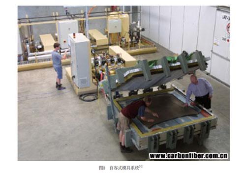 自容式模具(图3)系统,加热和加压是模具的一部分,热源可以是电、热油或蒸汽,能够解决一些热压罐的不足之处,可以用来生产大于现有设备的零部件,且具有成本低、升压速度快、温度控制精确的优点。