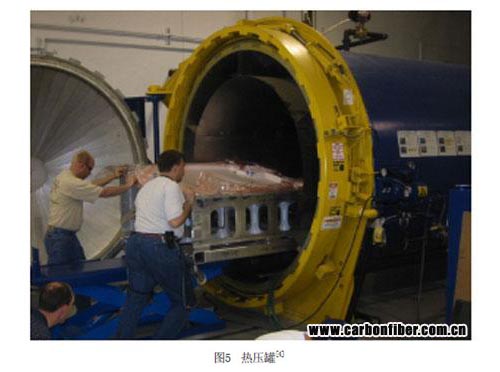 模具加热系统主要分为:热气外部加热,通常采用热压罐(图5)或水压罐加热;模具本身或与模具紧密接触台板的电加热;电加热毯局部加热;模具或台板内部的流体加热,通常采用蒸汽或热油;高速喷射气流加热系统;微波加热和感应加热系统,主要用于小零件,对于较厚的层合板,可使其从内到外发生固化。