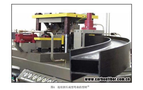 连续挤压是一种多工步过程,其成型模具为组合式,多运动部件组成。首先多层热塑性带在模具中加热并压成层合板,而后将层合板压入成型模具并加热压成所需截面的型材,最后将型材通过连续压模压成所需的弯曲形状,这种方法可以成型弯曲甚至扭转和变截面的型材零件,是一种新型的成型工艺。图4为其成型模具和设备。